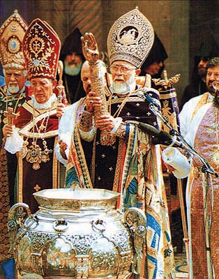 Մեռոնօրհնություն. Գարեգին I կաթողիկոսը ս. Գրիգոր Լուսավորչի աջով օրհնում է նոր մեռոնը